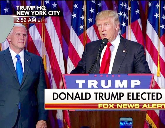 Image: Mr.Donald Trump with Governor Mike Pence at his campaign HQ. Nov 9 2016. Courtesy of Fox News.