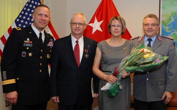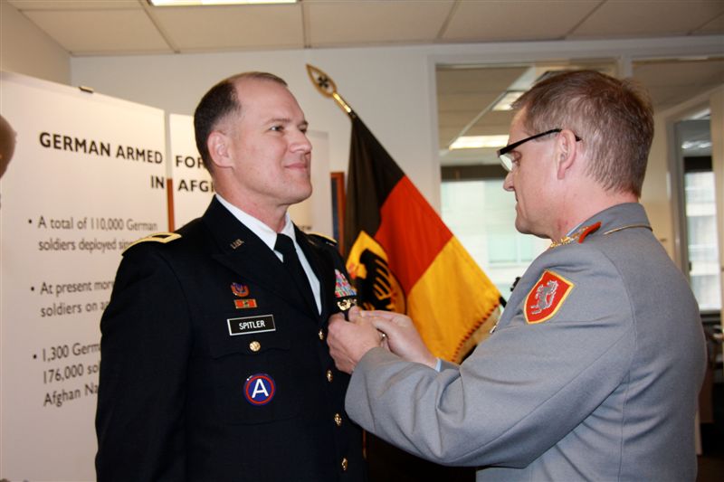 On behalf of Germany’s Minister of Defense, Brigadier General Backen awarded the German Armed Forces Cross of Honour in Silver to US Colonel John E. Novalis II.