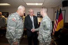 Germany Honorary Consul, Herr. Schumacher mit US Major General R. Martin Umbarger, and Captain Kain. (Image courtesy of Germany. Info und Sgt. 1st Class Matt Scotten, Indiana National Guard)