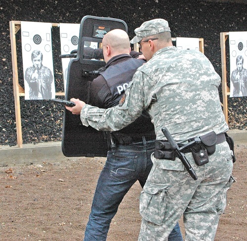 Army Sgt. of U.S. Army Garrison Wiesbaden Directorate of Emergency Services backs up German Polizeihauptkommissar during Partnership Law-Enforcement Training. WIESBADEN, Germany 2010 © EUCOM/U.S. Army Europe/Anemone Rueger.